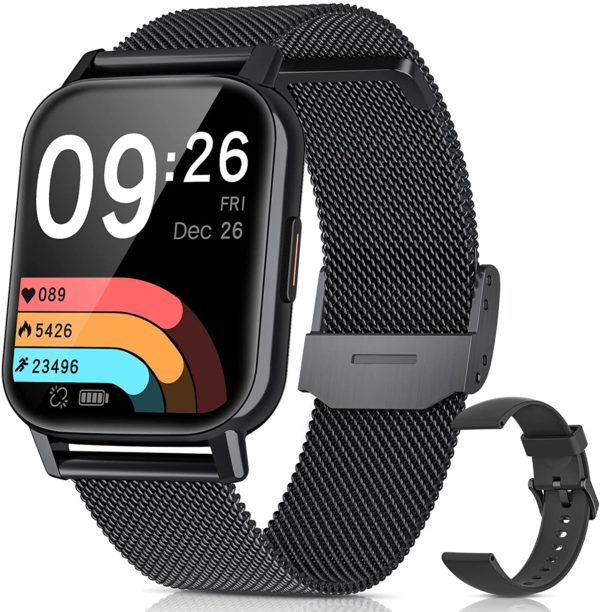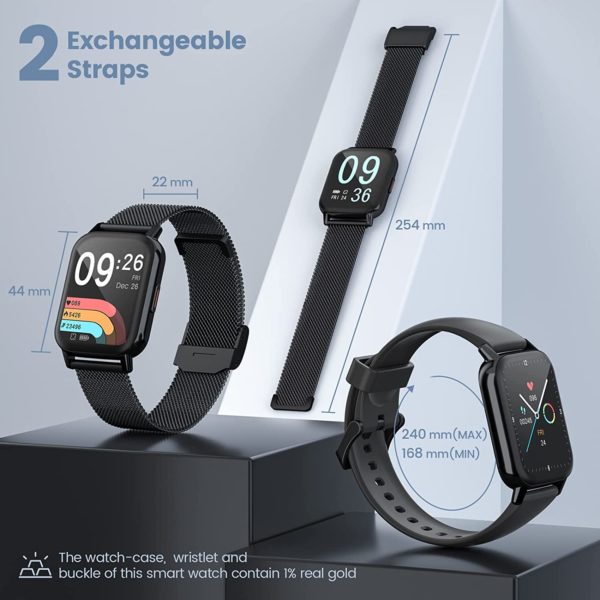 - 2 STYLES FOR YOU – OBKBO smart watch comes in a 1.69-inch HD LCD screen with a resolution of 240*280; the body adopts zinc alloy PVD gold-plated technology, a thickness of 0.25”. Interchangeable straps come in two different styles, materials, and colors(a skin-friendly silicone strap and stainless steel strap ). Easy to find the right look for the right time.