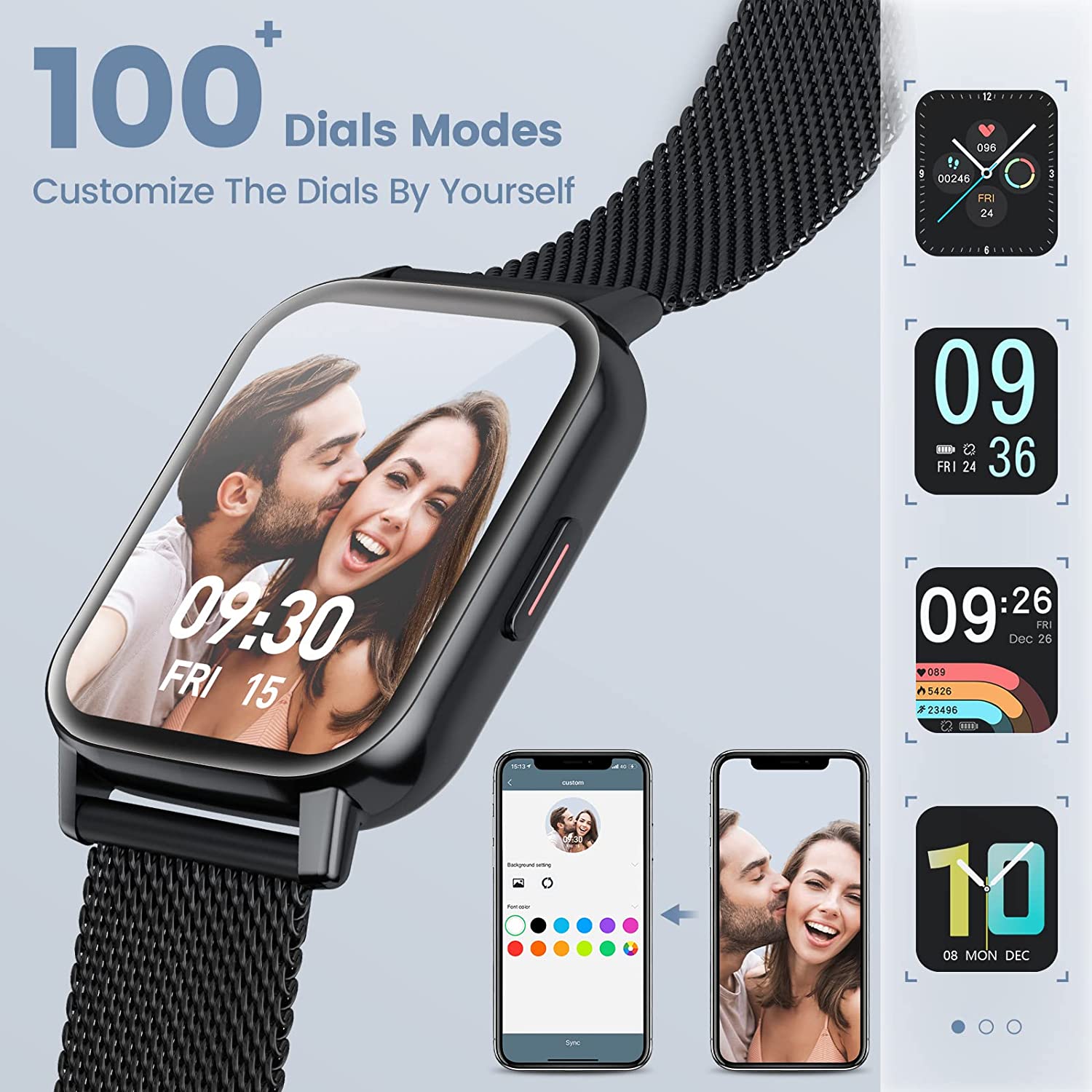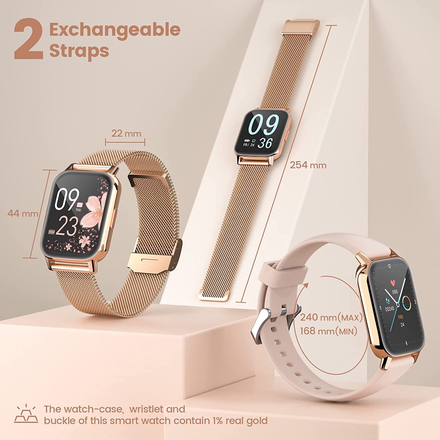 - 2 STYLES FOR YOU – OBKBO smart watch comes in a 1.69-inch HD LCD screen with a resolution of 240*280; the body adopts zinc alloy PVD gold-plated technology, a thickness of 0.25”. Interchangeable straps come in two different styles, materials, and colors(a skin-friendly silicone strap and stainless steel strap ). Easy to find the right look for the right time.