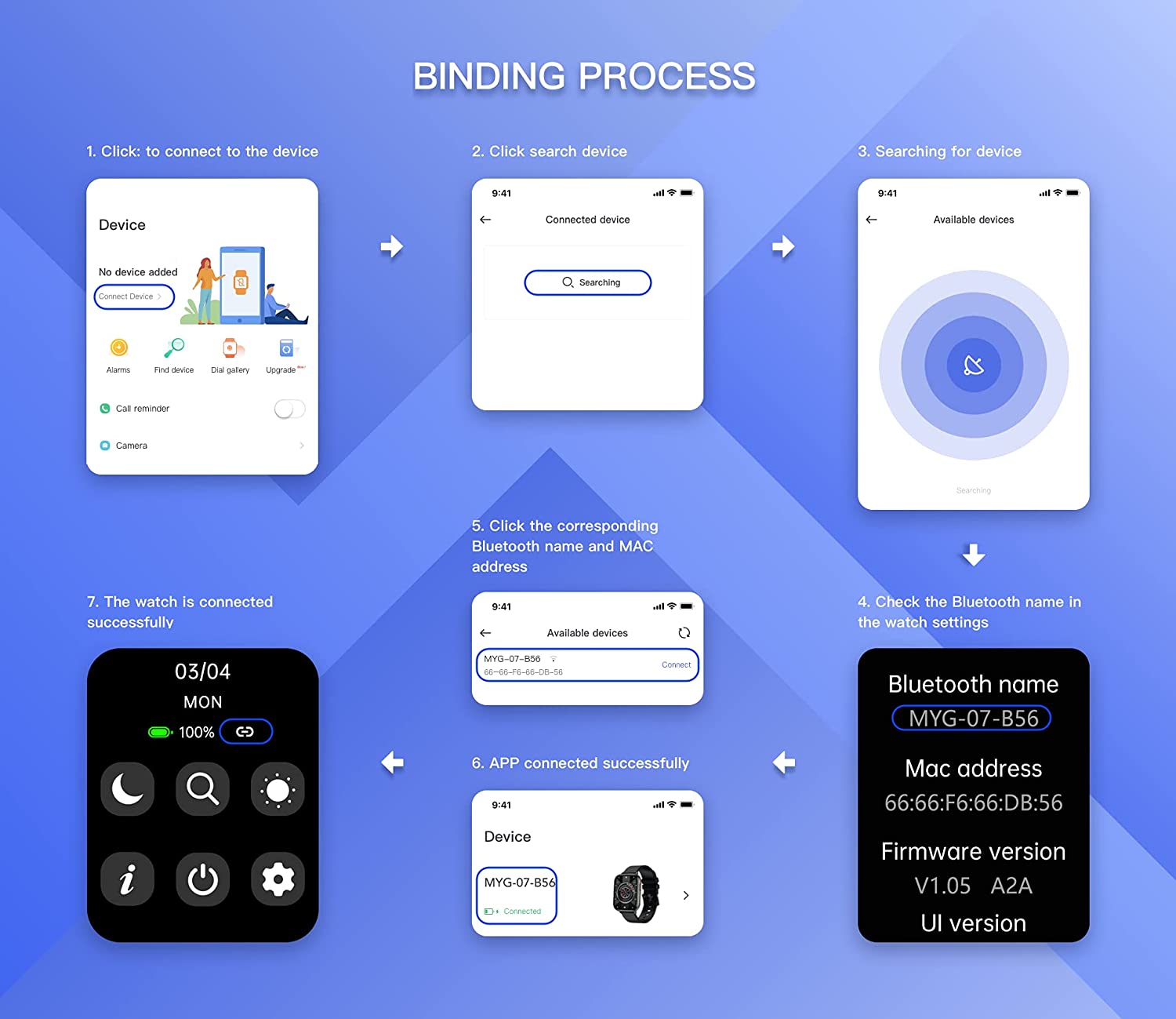 - A Hello, thank you for your question. For this question, you can view it through the video.Connection stepsStep 1: Turn on your phone's BluetoothStep 2: Open the watch, find the QR code, scan it with your phone, and download the "OnWear" AppStep 3: Click the serial number of the watch, search the serial number of the watch on your phone and click connect.Hope to help you, if you have any other questions, please contact us in time, we will provide satisfactory after-sales service.